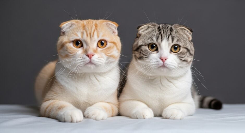 小さめで前方に折れた“Fold(折れ耳)”、丸顔・大きな目・ころんとした体つきが魅力。穏やかな気質で静かな暮らしに馴染みやすい。折れ耳は軟骨の遺伝的変化によるため、歩様や関節の観察・ケアが重要。