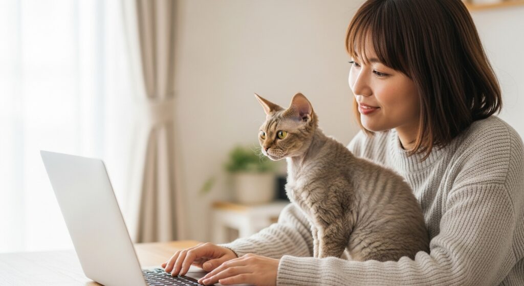 日中は、キャットタワーからタワーへ軽やかに飛び移ったり、ボールをくわえて持ってきて「もう一回投げて!」と誘ってきたり。遊びの時間は元気いっぱいですが、満足すると急に電池が切れたように、家族のそばでぐっすり眠り始めます。デボン・レックスとの暮らしは、「よく遊び、よく甘えて、よくくっついてくる」時間の積み重ね。ちょっと手はかかるけれど、そのぶん毎日がにぎやかで、家のどこにいても“見守られている”ようなあたたかさがあります。